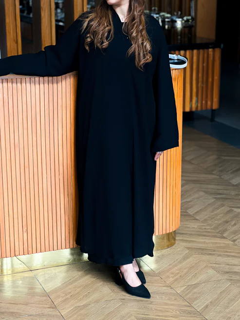 A celebration of understated elegance, this black abaya is crafted from authentic Korean Nida Zoom fabric, prized for its luxurious drape and feather-light comfort.
