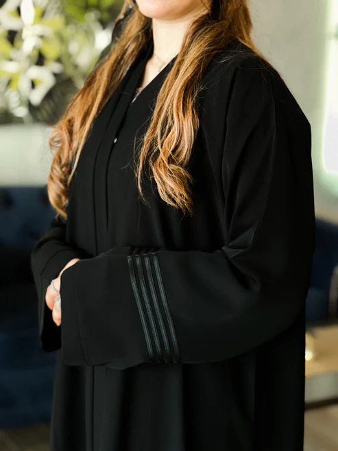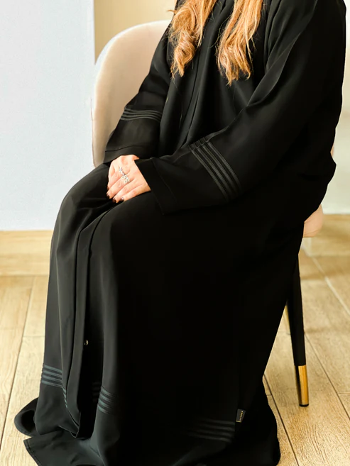 Our classic black abaya, tailored from premium Korean Nida fabric, features subtle pintuck detailing on the sleeves and hem — creating a clean, refined silhouette.