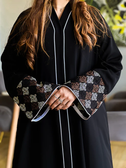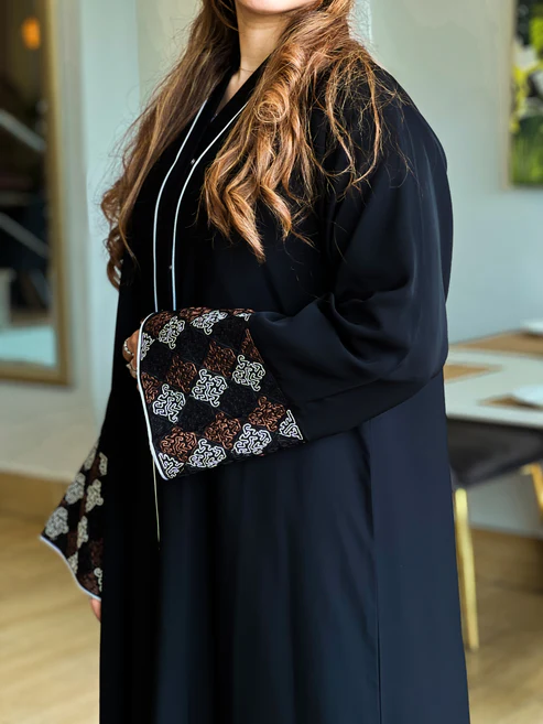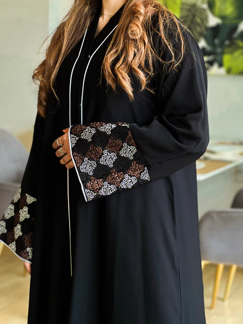 Our elegant black abaya, crafted in authentic Korean Nida fabric, features delicate white floral embroidery along the sleeves and hem, adding a soft, graceful charm to its flowing silhouette.