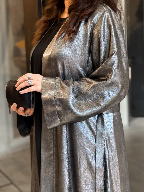 Our stunning grey shimmer abaya is designed to make a statement. Crafted from premium shimmer fabric, it offers a soft, fluid drape with a subtle metallic sheen that catches the light beautifully. This open-front abaya comes with a matching belt, allowing you to style it cinched for a defined silhouette or loose for an effortless flow. Lightweight yet luxurious, it’s perfect for evening gatherings, formal occasions, or any event where you want to stand out. Disclaimer: Color/Shine may vary slightly due to lighting, photography, and the fabric’s natural shimmery trait. Color: Grey Fabric: Premium Shimmer Design: Front open, with matching belt